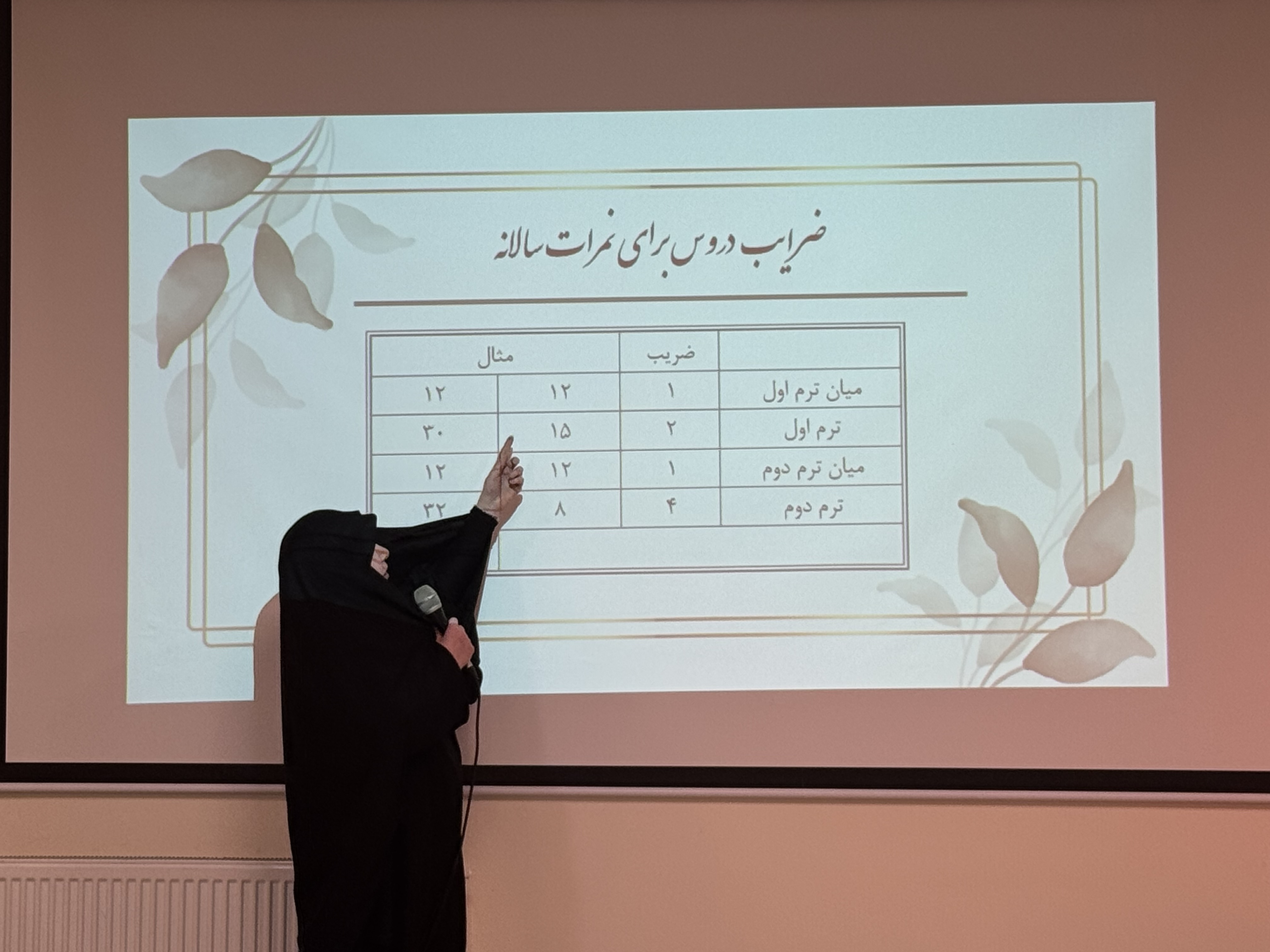 در بخش آموزشی جلسه، نکات مهم و ضروری پیرامون روند تحصیلی، انضباطی و تربیتی دانشآموزان مطرح شد و با همراهی دخترانمان، بر ضرورت همکاری و همافزایی والدین و مدرسه برای دستیابی به پیشرفت تحصیلی و تعالی اخلاقی تأکید گردید.